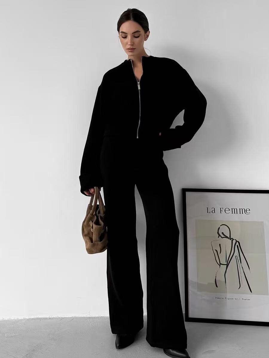 Stylowy komplet dzianinowy to idealny wybór dla kobiet, które cenią wygodę w eleganckim wydaniu. Luźna bluza zapinana na zamek i spodnie o prostym kroju tworzą spójną całość, zapewniając maksymalny komfort noszenia. Miękka, elastyczna dzianina doskonale dopasowuje się do sylwetki, podkreślając jej naturalny kształt. Idealny na co dzień, do pracy lub weekendowy relaks – w pełnym stylu Luxurie.