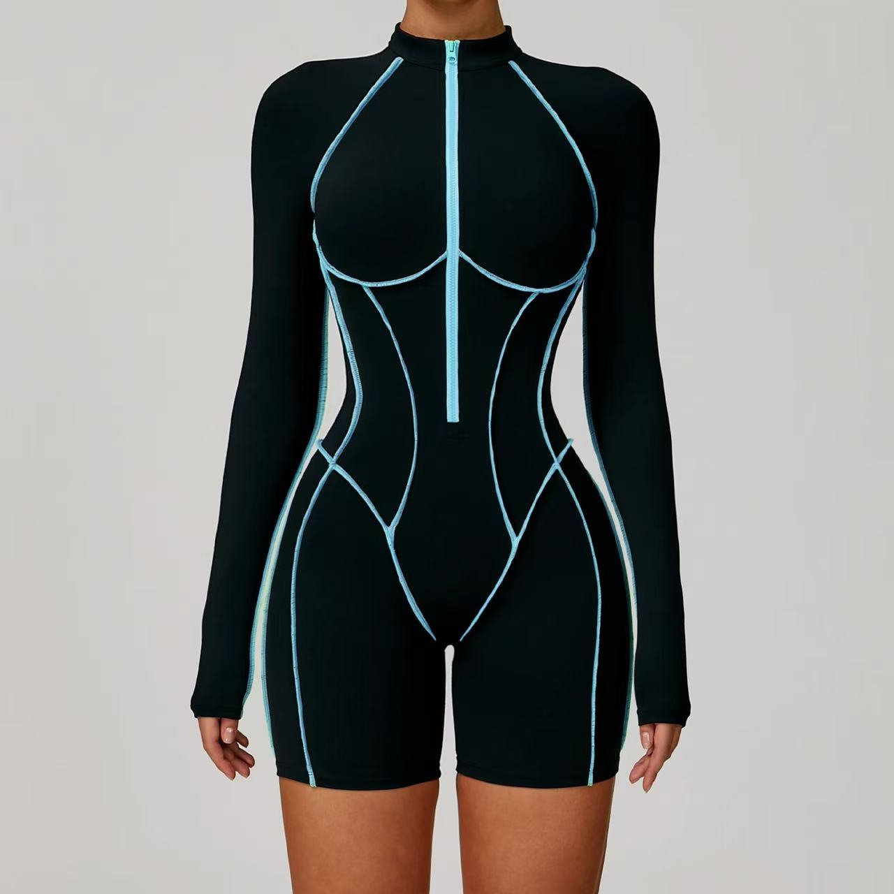 Kombinezon sportowy damski krótki z długim rękawem i kontrastowymi przeszyciami