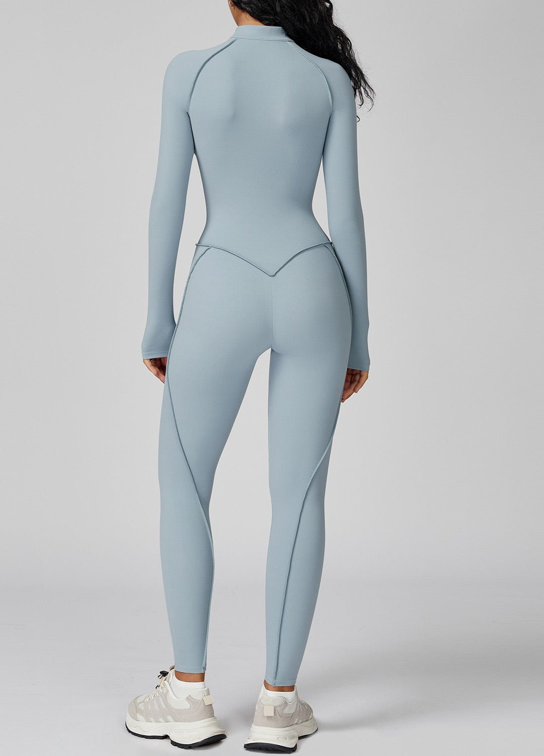 Ten kombinezon sportowy został zaprojektowany z myślą o kobietach, które chcą połączyć wygodę i nowoczesny wygląd. Dopasowany krój w połączeniu z efektownymi przeszyciami subtelnie modeluje sylwetkę, podkreślając jej atuty. Długie rękawy oraz wysoka stójka z zamkiem dodają całości sportowego charakteru, a jednocześnie zapewniają komfort w chłodniejsze dni. Wykonany z elastycznego, oddychającego materiału gwarantuje swobodę ruchów podczas treningu, jogi, fitnessu czy codziennych aktywności. To funkcjonalny i stylowy wybór, który sprawdzi się zarówno na siłowni, jak i w casualowych stylizacjach.