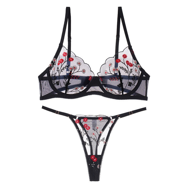 Elegancki komplet bielizny damskiej w kolorze czarnym, ozdobiony subtelnym haftem kwiatowym w odcieniach czerwieni i bieli. Transparentna koronka nadaje całości lekkości i zmysłowego charakteru, a jednocześnie pięknie podkreśla sylwetkę. Biustonosz z usztywnianymi miseczkami zapewnia delikatne podparcie, a dopasowane majtki typu string tworzą spójną i stylową całość. To komplet, który łączy romantyczny urok z kobiecą elegancją, idealny zarówno na co dzień, jak i na wyjątkowe okazje.