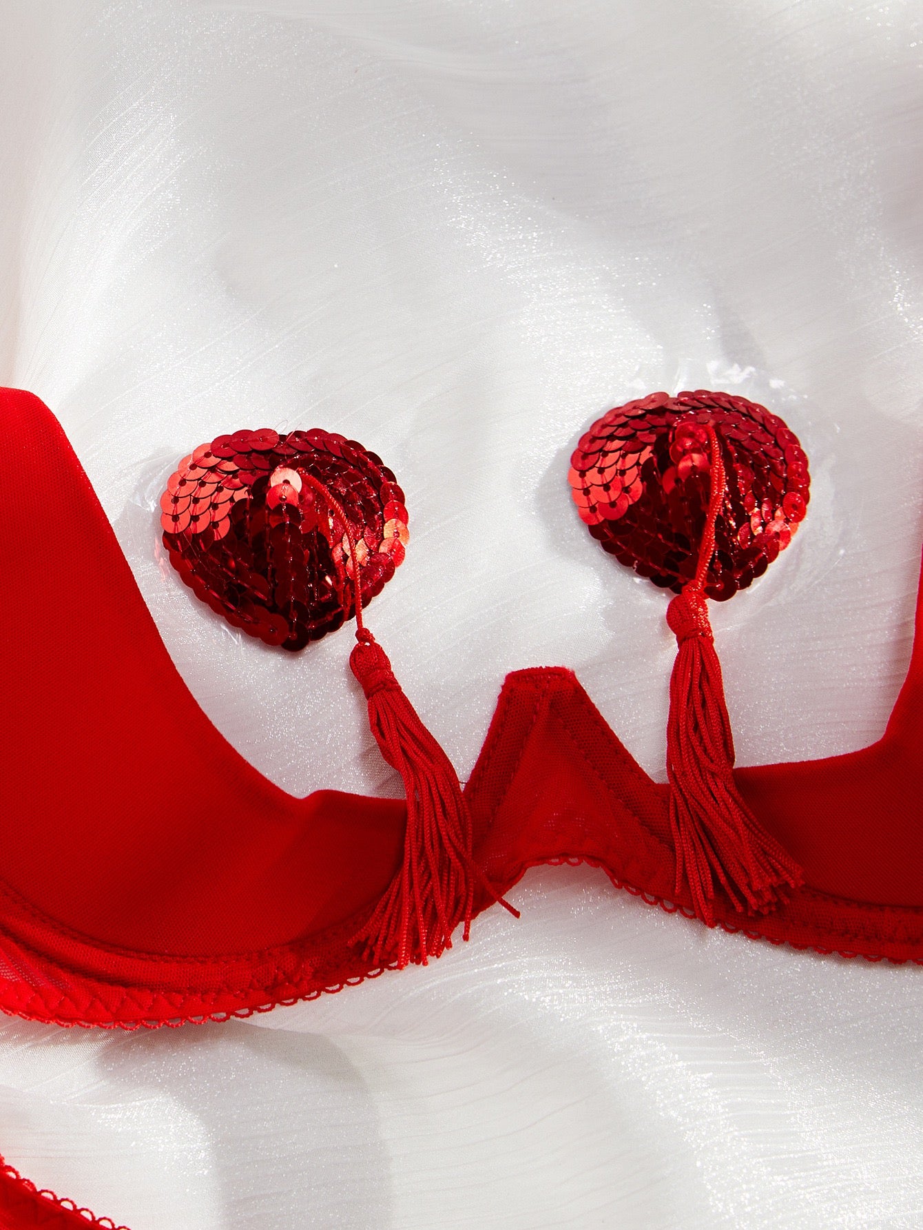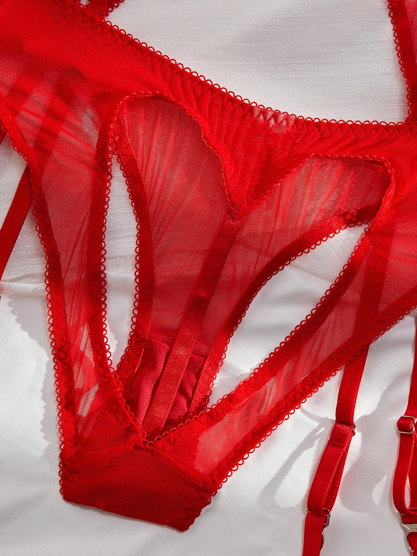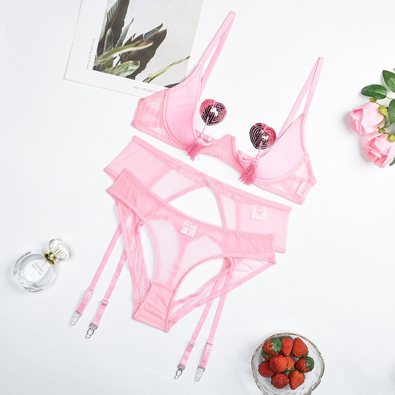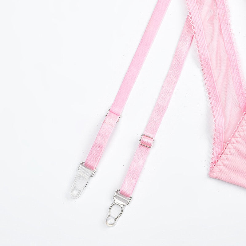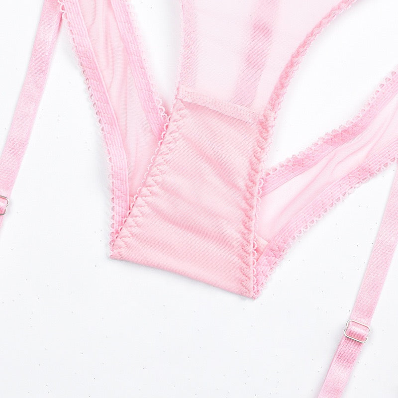 Zmysłowy komplet bielizny damskiej, który podkreśli kobiece kształty i doda pewności siebie. Delikatna, różowa tkanina w połączeniu z transparentnymi wstawkami oraz dekoracyjnymi wycięciami tworzy uwodzicielski efekt, idealny na wyjątkowe okazje. Regulowane ramiączka i paski zapewniają perfekcyjne dopasowanie, a oryginalny krój z subtelnym sercowym motywem na plecach dodaje całości wyjątkowego charakteru. To komplet, w którym każda kobieta poczuje się stylowo, zmysłowo i niezwykle atrakcyjnie.